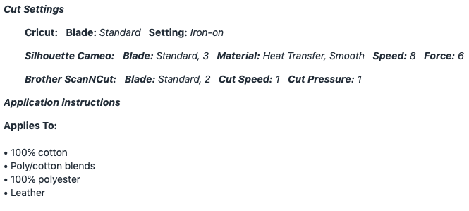 Silhouette Cameo: Blade: Standard, 3 Material: Heat Transfer, Smooth Speed: 8 Force: 6