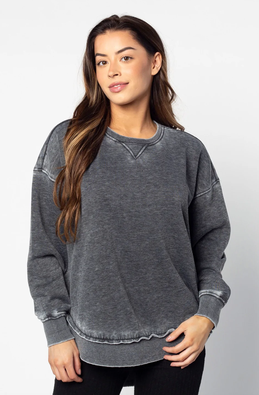 This ultra-soft crew neck with dropped shoulders and relaxed hi-lo curved bottom hemline features ribbed neckline, cuffs and hem. Our favorite worn look is achieved by the burnout wash process.