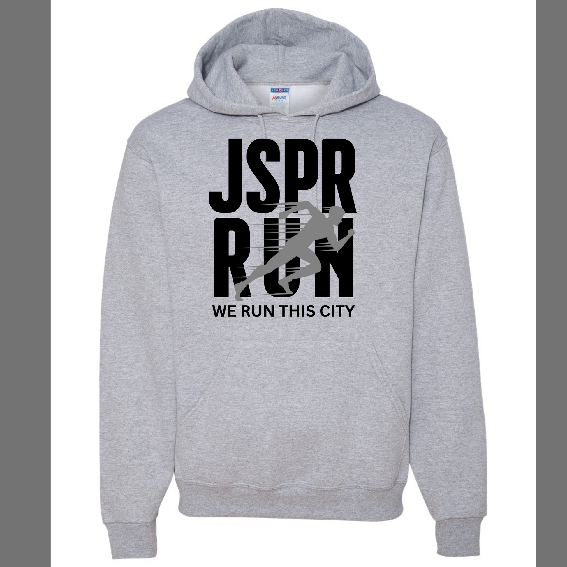 - The JSPR Run We Run This City - Hoody is made of 8 oz./yd², a 50/50 blend of cotton and polyester, with Oxford material containing 48/52 cotton/polyester. The NuBlend® pill-resistant fleece is pre-shrunk and has a high-stitch density for a smooth printing surface. The 2-ply hood has grommets and a matching drawcord, and the neck, armholes, and waistband are double-needle stitched. Keep your hands warm with the pouch pocket, and enjoy the comfort of 1x1 ribbed cuffs and waistband with spandex. This versatile piece also features a quarter-turned design and a convenient tear-away label.