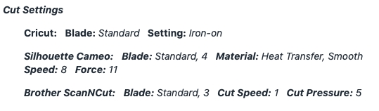 Silhouette Cameo: Blade: Standard, 4 Material: Heat Transfer, Smooth Speed: 8 Force: 11